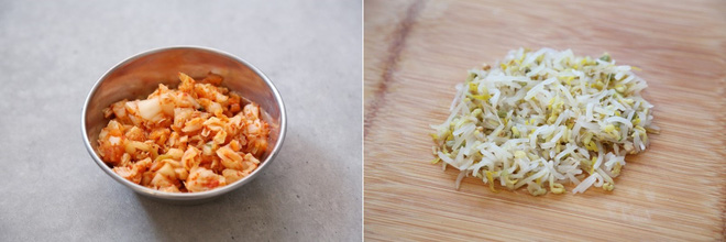 Kim chi thái nhỏ, giá đỗ chần qua nước nóng rồi thái nhỏ.