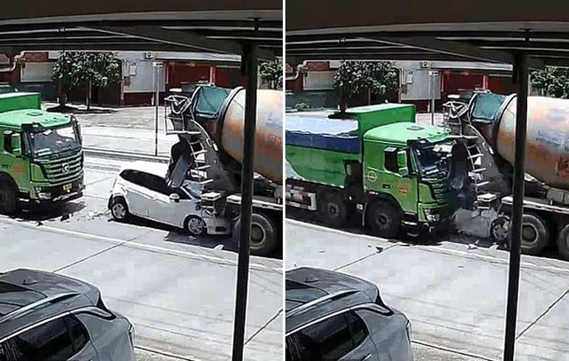 Tuy nhiên, chiếc xe tải dường như mất kiểm soát, tăng tốc lao về phía trước khiến ôtô con bị văng vào sau xe trộn bê tông, bẹp đầu. Chưa dừng ở đó, xe tải đâm lên tiếp làm xe con bẹp cả phần đuôi.