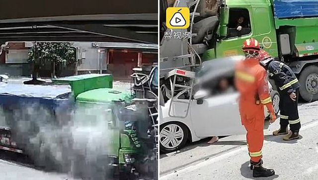 Theo cảnh sát tỉnh Phúc Kiến, một chiếc xe hơi bị hư hỏng hoàn toàn sau khi bị xe tải mất lái đâm trên đường phố ở huyện Tiên Du, thành phố Phủ Điền, hôm 15/6. Đoạn video do camera an ninh ghi lại cho thấy chiếc xe đang chờ phía sau một xe trộn bê tông thì xe tải hạng nặng màu xanh đi tới.