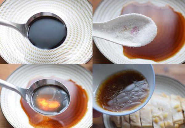 Phần nước gà có trong đĩa sau khi hấp cho ra bát, thêm 15ml nước tương, một ít đường, dầu mè vào trộn đều sau đó đổ lên đĩa thịt gà, thêm chút rau mùi thái nhỏ vào là xong.