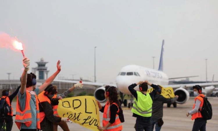Trước khi bị bắt, các nhà hoạt động đã giương cao biểu ngữ "Hãy cứu mạng người chứ không phải máy bay" và "15 tỷ để tái khởi động thảm họa", đề cập tới việc chính phủ Pháp chi 15 tỷ euro (khoảng 17 tỷ USD) để cứu trợ ngành hàng không hứng chịu tổn thất nặng nề do Covid-19.