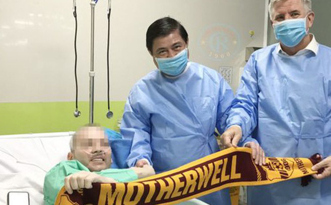Chủ tịch UBND TP.HCM Nguyễn Thành Phong (giữa) và Tổng lãnh sự Anh tại TP.HCM Ian Gibbons thăm bệnh nhân 91. Ảnh: BV Chợ Rẫy