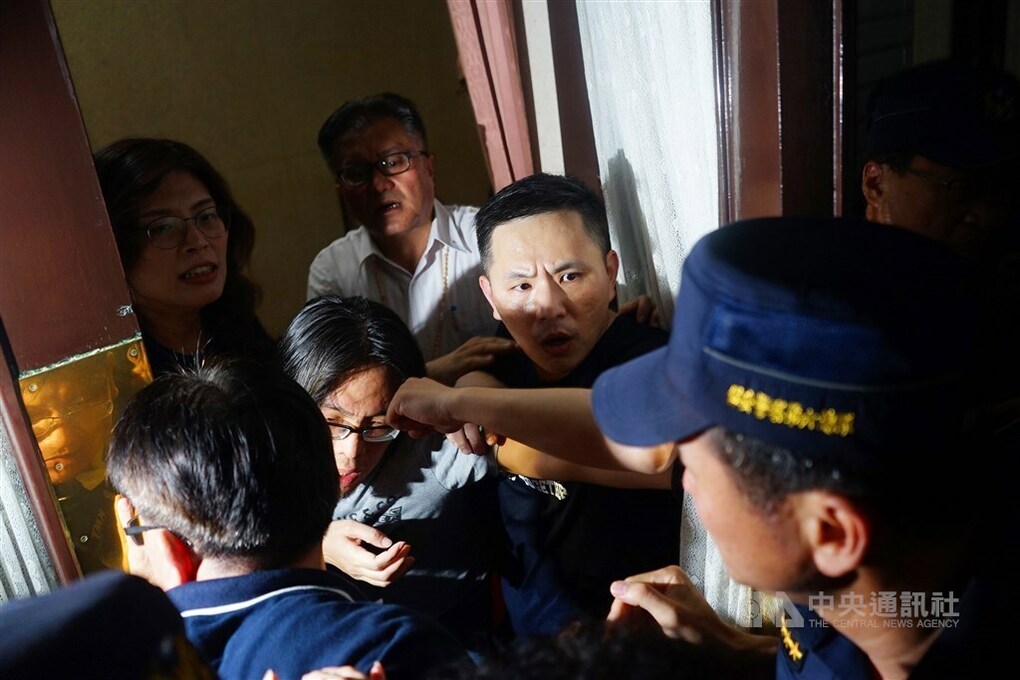 Các nghị sĩ Quốc Dân đảng tranh cãi với cảnh sát tại lối vào tòa nhà nghị viện đêm 28/6. Ảnh: CNA.