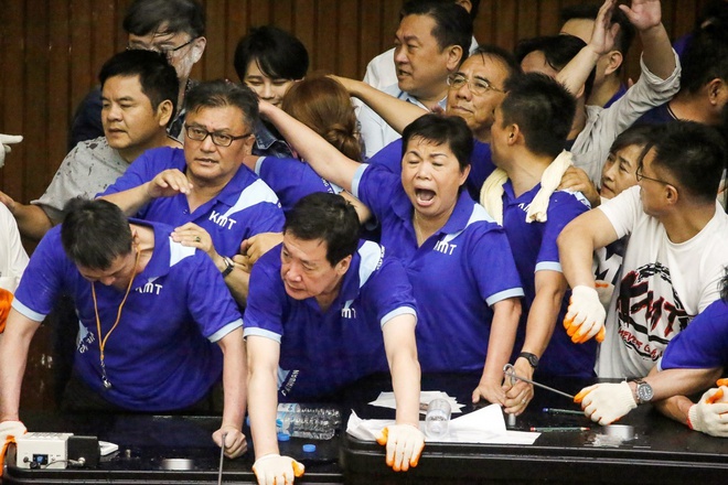 Ẩu đả nổ ra tại Lập Pháp Viện Đài Loan ngày 29/6 sau khi các nghị sĩ Quốc dân đảng (KMT) tìm cách chiếm tòa nhà để phản đối phe cầm quyền. Họ chặn lối ra vào bằng ghế và lấy dây xích khóa cửa từ đêm hôm trước.