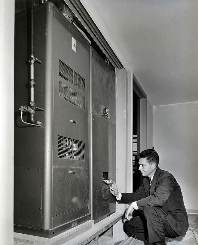 Một người quan sát hệ thống điều hòa tổng trong một căn nhà ở làng điều hòa. Ảnh: Dewey G. Mears/Austin Public Library.