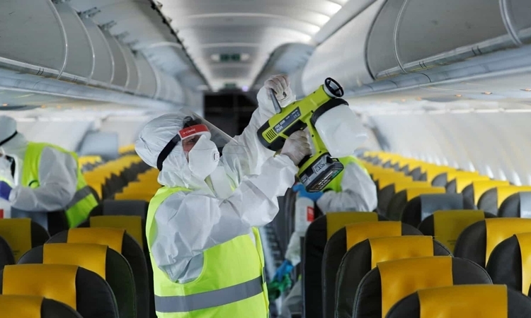 Nhân viên khử trùng máy bay tại sân bay quốc tế Fiumicino, Rome, Italy, hôm 4/6. Ảnh: Reuters.