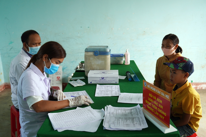 Cán bộ Y Tế huyện Đăk Glong, Đăk Nông làm thủ tục tiêm chủng vaccine bạch hầu cho người dân xã Quảng Hòa, sáng 28/6. Ảnh: Trần Hóa.
