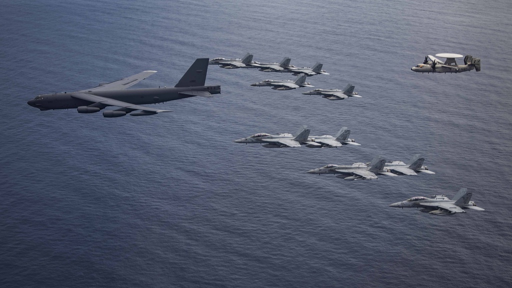 Máy bay ném bom chiến lược B-52 cùng các tiêm kích trên hạm F/A-18 tập trận trên Biển Đông. Ảnh: USAF.
