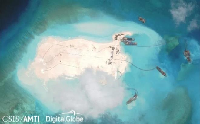 Ảnh chụp năm 2014 cho thấy các tàu nạo vét Trung Quốc tham gia bồi đắp phi pháp Đá Chữ Thập thuộc quần đảo Trường Sa của Việt Nam nhưng bị Bắc Kinh chiếm đóng trái phép (Ảnh: CSIS/AMTI)