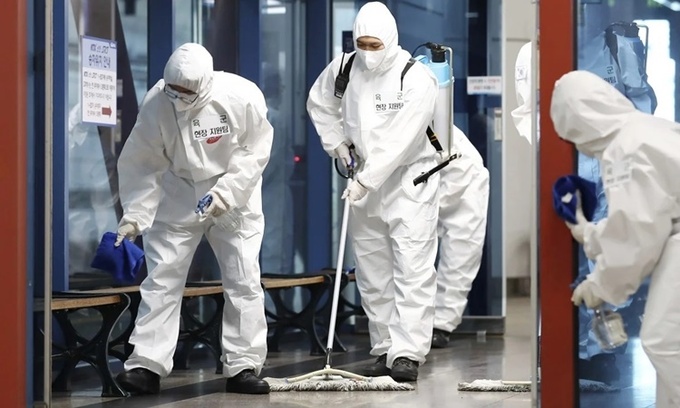 Các binh sĩ Hàn Quốc tẩy trùng một ga tàu điện ngầm ở Daejeon. Ảnh: AP.
