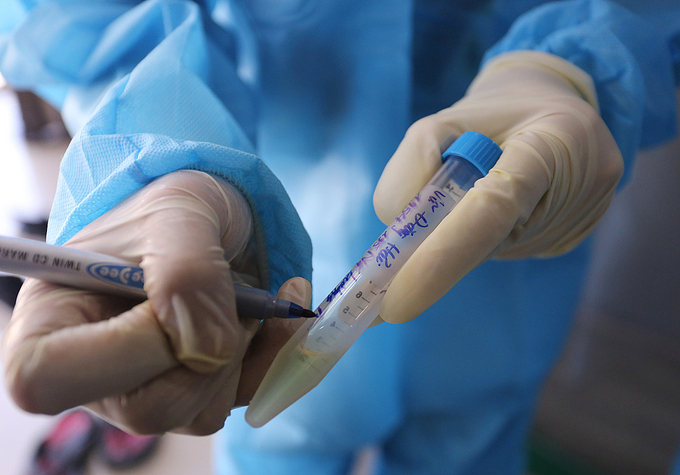 Nhân viên y tế quận Liên Chiểu, TP Đà Nẵng ghi mẫu bệnh phẩm của người tiếp xúc với bệnh nhân nhiễm Covid-19, ngày 25/7. Ảnh: Đắc Thành