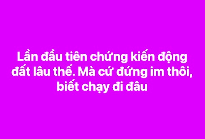"Động đất à mọi người ơi? Sợ quá! Sợ quá!", Facebooker Liem Cavalry hỏi. Tương tự, các Facebooker Đinh Huyền Trang hay Vi Hương cũng chia sẻ thông tin tương tự: "Động đất ạ? Giường rung bần bật", "Động đất à các chị? Có ai thấy rung bần bật không?",...