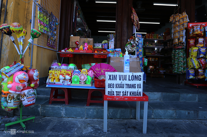 Một cửa hàng yêu cầu khách vào mua hàng đeo khẩu trang, rửa tay sát khuẩn trên đường Trần Quý Cáp, TP Hội An chiều 29/7. Ảnh: Đắc Thành.