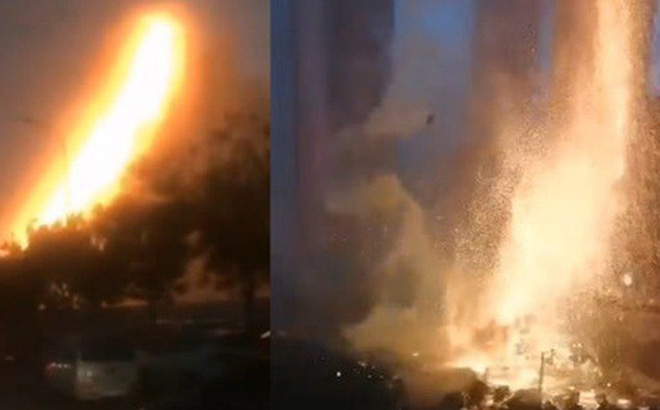 Đoạn clip được chia sẻ trên mạng cho thấy sau tia chớp, đột nhiên vọng lên một âm thanh lớn giống như tiếng bom nổ, trong nháy mắt một cột sáng màu cam đánh vào một tòa nhà cao tầng gần đó, tia lửa xuất hiện khắp nơi rồi rơi xuống mặt đất.