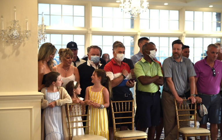Các phóng viên có mặt ở đây trước buổi họp báo chứng kiến thành viên của câu lạc bộ golf, nhiều người mang theo ly rượu, vội vã từ phòng ăn trên lầu xuống phòng khiêu vũ ở tầng một. Cũng giống như các phóng viên, họ đã được kiểm tra thân nhiệt nhưng cả hai nhóm đều không được kiểm tra nhanh Covid-19, việc thường được Nhà Trắng thực hiện với bất cứ ai ở gần tổng thống.