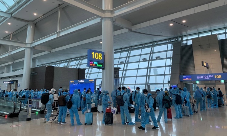 Công dân Việt Nam tại Hàn Quốc xếp hàng lên máy bay về nước ngày 9/8. Ảnh: Bộ Ngoại giao.