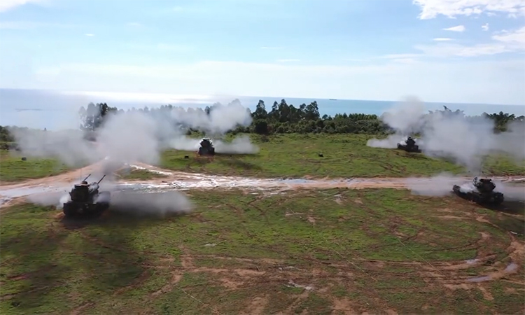 Các tổ hợp phòng không khai hỏa trong diễn tập gồm pháo hai nòng 35 mm PGZ-09 và pháo 4 nòng 25 mm PGZ-95, thuộc biên chế tập đoàn quân số 75 của Bộ Tư lệnh Chiến khu phía Nam.
