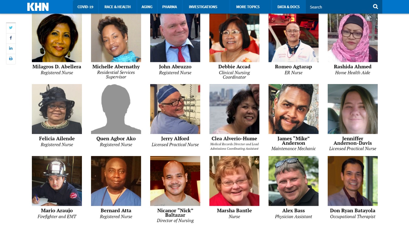 Cho đến nay, cơ sở dữ liệu từ Guardian và KHN đã xác định được danh tính của 167 nhân viên y tế đã tử vong, và công bố tên tuổi, thông tin cá nhân, những câu chuyện về cuộc đời của họ và những điều khiến họ luôn được tưởng nhớ. Danh sách này bao gồm các bác sĩ, điều dưỡng viên, nhân viên y tế, cũng như các bộ phận hỗ trợ thiết yếu khác như nhân viên vệ sinh, quản lý bệnh viện và nhân viên viện dưỡng lão, những người đã bất chấp cả tính mạng của mình trong đại dịch để vì sự sống của những người khác.
