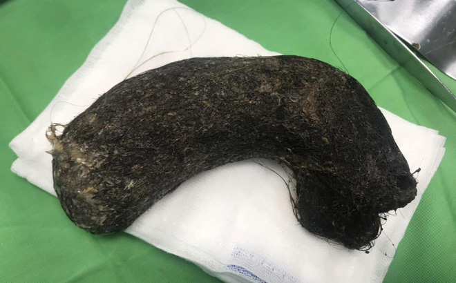 Khi phẫu thuật, bác sỹ phát hiện bệnh nhi có 1 búi tóc rất lớn, nặng khoảng 1kg làm tắc nghẽn toàn bộ đường thoát dạ dày xuống ruột non.