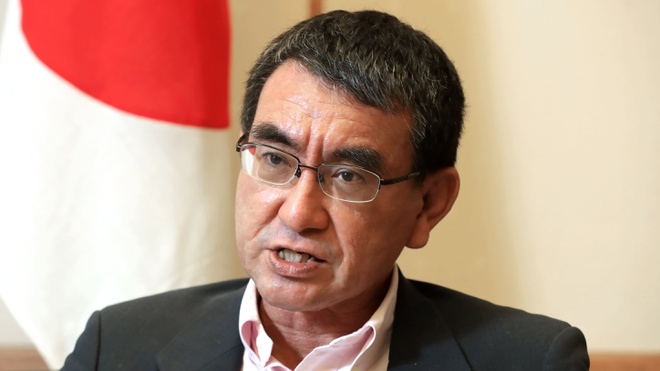 Bộ trưởng Quốc phòng Nhật Bản Taro Kono trả lời trong cuộc phỏng vấn hôm 12/8 ở Tokyo. Ảnh: Nikkei.