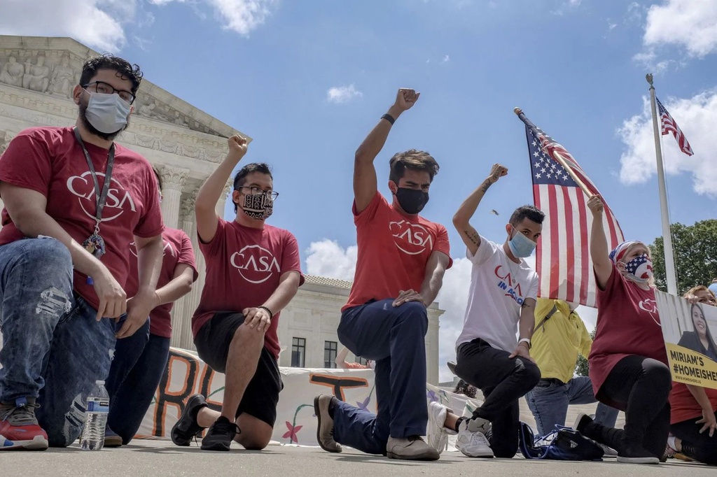 Những người ủng hộ chương trình DACA biểu tình bên ngoài Tòa án Tối cao vào ngày 18/6. Ảnh: Bloomberg.