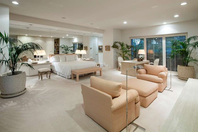 Phòng ngủ chính trang nhã, thanh lịch, được tích hợp với một khu vực tiếp khách nhỏ nhắn.