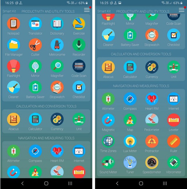 Smart Kit 360 là ứng dụng miễn phí, tập hợp các công cụ cần thiết để biến smartphone thành một thiết bị đa năng và rất hữu ích trong cuộc sống. Ứng dụng cung cấp nhiều tính năng như la bàn, kính lúp, bộ đo âm thanh, thiết bị đếm bước chân, kiểm tra tốc độ kết nối Internet, chuyển đổi đơn vị đo...