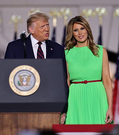 Chiếc váy xếp li dài phủ gót ngay lập tức khiến Đệ nhất phu nhân Mỹ thu hút mọi ánh nhìn khi bà nắm tay Tổng thống Trump bước vào Bãi cỏ Phía nam Nhà Trắng tối 27/8. Bà càng nổi bật giữa một biển khách mời mặc đồ tối màu khi phối váy xanh với thắt lưng mảnh màu đỏ và đôi giày cao gót cùng tông.