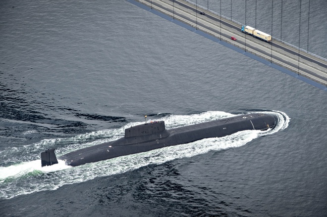 Tàu ngầm hạt nhân Nga Dmitrij Donskoj đi qua vùng biển Đan Mạch năm 2017. Ảnh: AFP.