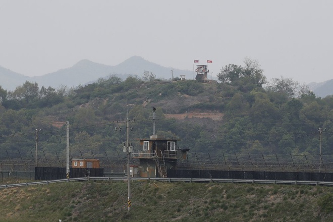 Các chốt bảo vệ quân sự của Triều Tiên (trên) và Hàn Quốc (dưới) ở Paju tại biên giới giữa hai nước vào ngày 3/5. Biên giới liên Triều là một trong những nơi được canh phòng nghiêm ngặt nhất thế giới. Ảnh: AP.