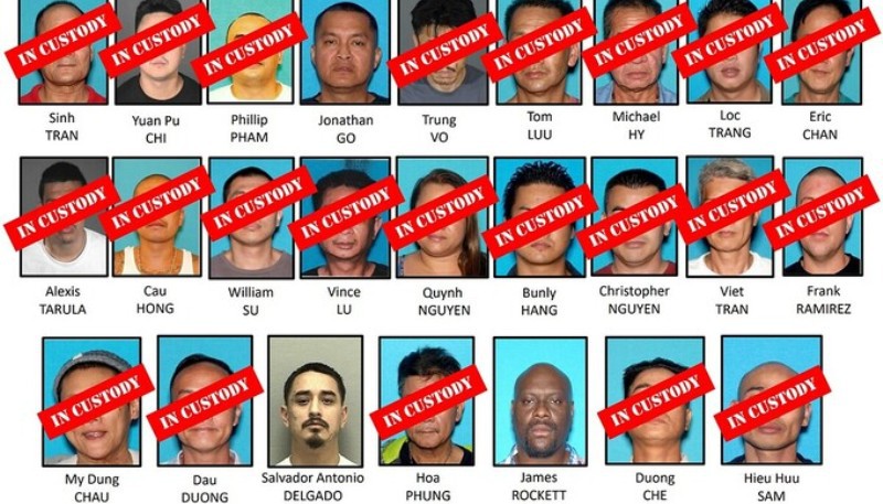 Trong số những nghi phạm bị bắt giữ có hai người gốc Việt là Dau Quay Duong, 53 tuổi, và Christopher Nguyen, 47 tuổi, hiện đang sinh sống tại thành phố Otario, bang California, bị truy tố với tội danh buôn bán 5 khẩu súng trường AR-15 không có nhãn hiệu, mẫu hay số seri, một nghi phạm khác là Jonathon Domingo Go, 47 tuổi, ở Torrance cũng bị truy tố cùng tội danh trong 1 bản cáo trạng khác.