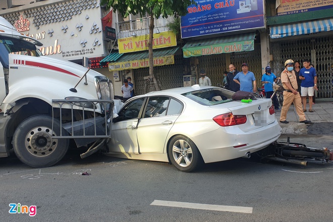 Đến trước địa chỉ 721 đường 3 Tháng 2 (phường 6, quận 10), xe đầu kéo húc văng dải phân cách bằng sắt, lao sang làn đường ngược lại rồi tông liên tiếp 2 xe máy và một ôtô hiệu BMW.
