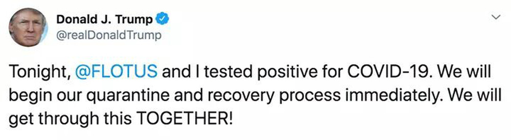 "Tối nay, Đệ nhất phu nhân và tôi đã có kết quả dương tính, mắc COVID-19. Chúng tôi sẽ bắt đầu cách ly và bắt đầu quá trình phục hồi ngay. Chúng tôi sẽ vượt qua CÙNG NHAU!".