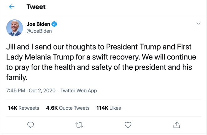 "Jill và tôi gửi những lời chúc tới Tổng thống Trump và Đệ nhất phu nhân Melania Trump, mong họ mau chóng hồi phục. Chúng tôi sẽ tiếp tục cầu nguyện cho sức khỏe và sự an toàn của tổng thống và gia đình của ông ấy", ông Joe Biden cho biết trên Twitter.