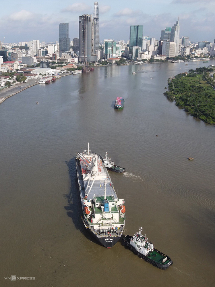 Tàu Bayani chở toa Metro Số 1 trên đường vào cảng Khánh Hội, quận 4, sáng 8/10. Ảnh: Hữu Khoa.