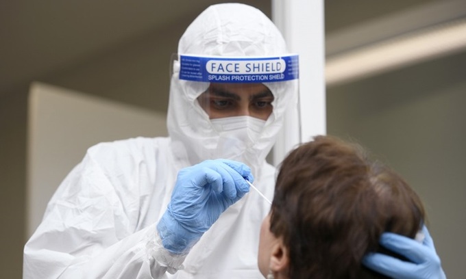 Nhân viên y tế Đức lấy mẫu xét nghiệm Covid-19 cho người dân tại một nhà ga ở Cologne hôm 15/10. Ảnh: AFP.