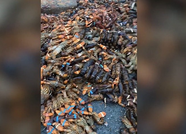 Video từ hiện trường cho thấy hàng loạt thùng tôm hùm bị đổ bỏ la liệt trên sàn. Ảnh: chụp màn hình.