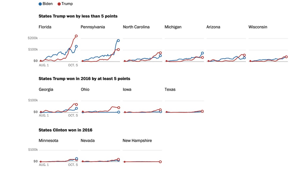 NPR thống kê rằng chiến dịch của ông Biden đang chi tiền quảng cáo nhiều hơn tới 240 triệu USD so với chiến dịch của ông Trump ở 6 bang chiến trường là Florida, Pennsylvania, Michigan, North Carolina, Wisconsin và Arizona.