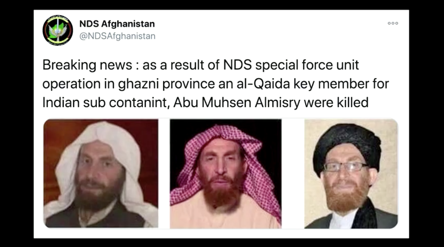 NDS cho biết Al-Masri, được cho là chỉ huy thứ hai của al Qaeda, bị giết trong một chiến dịch đặc biệt ở tỉnh Ghazni. FBI cho biết phiến quân al Qaeda, còn có tên là Husam Abd-al-Ra’uf, mang quốc tịch Ai Cập. Hồi tháng trước, Ngoại trưởng Hoa Kỳ Mike Pompeo cho biết có ít hơn 200 phiến quân al Qaeda ở lại Afghanistan.