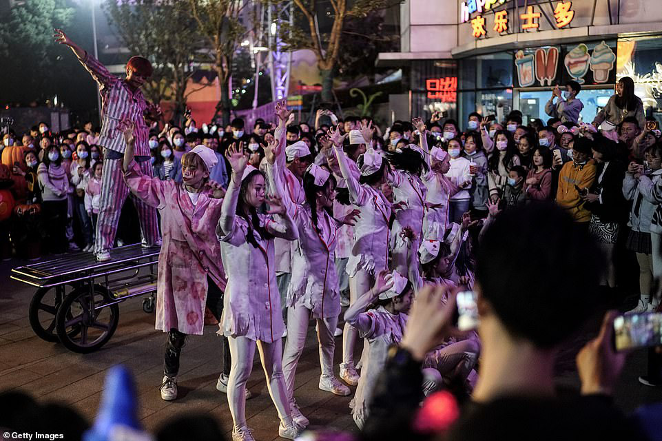 Nhiều người dân Trung Quốc chật cứng người vui chơi Halloween, 10 tháng tại các đường phố của Vũ Hán sau khi đại dịch Covid-19 bắt đầu ở đó - trong khi phần còn lại của thế giới đang bị tê liệt bởi đại dịch.