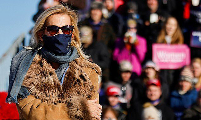 Phóng viên Laura Ingraham của Fox News đeo khẩu trang tại sự kiện tranh cử của Tổng thống Trump ở Michigan hôm 30/10. Ảnh: Reuters.