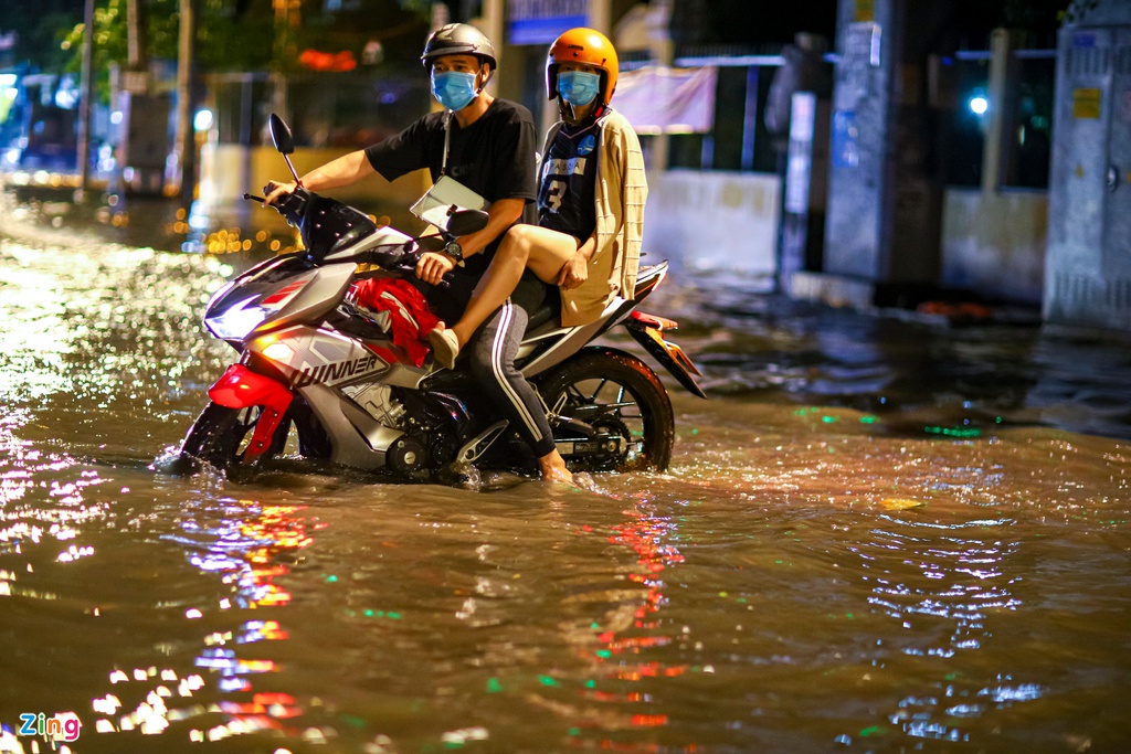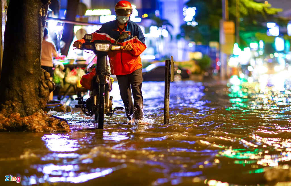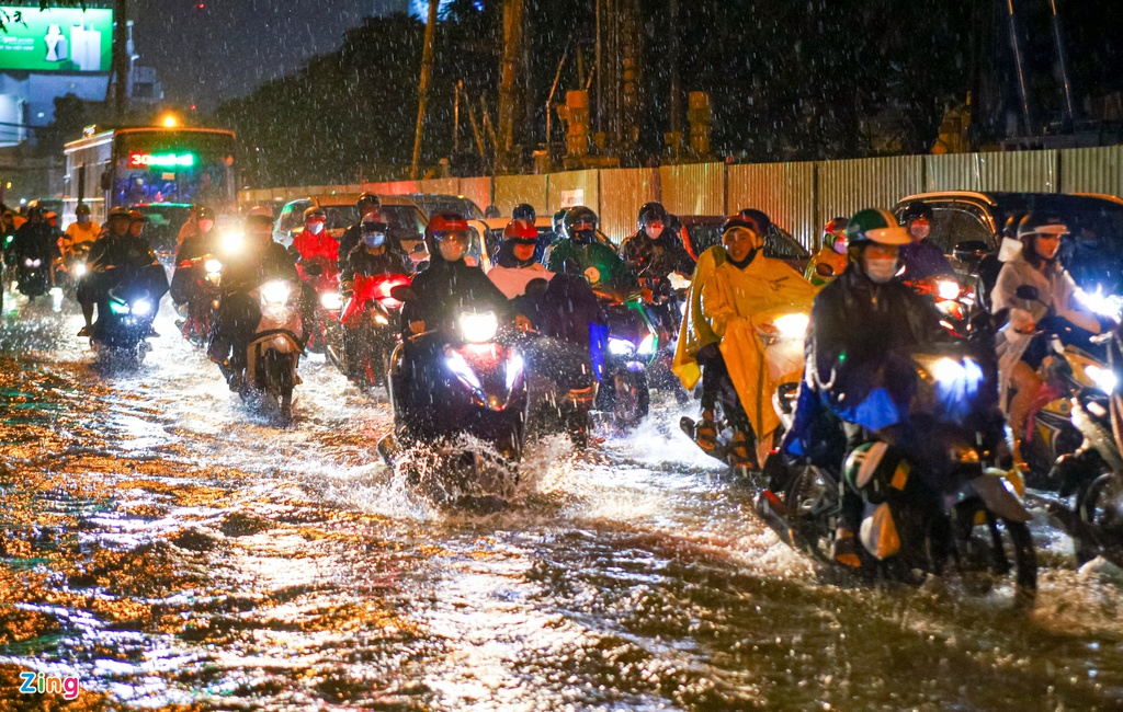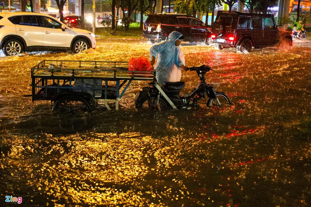Nhiều xe lưu thông trên đường Nguyễn Hữu Cảnh (quận Bình Thạnh) chết máy. Người dân vất vả dắt xe đi dưới cơn mưa như trút để về nhà.