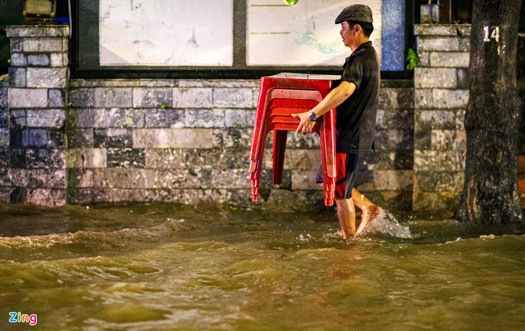 Gần 20h, đường Quốc Hương, Nguyễn Văn Hưởng vẫn ngập sâu, hàng quán tại đây đóng cửa sớm.
