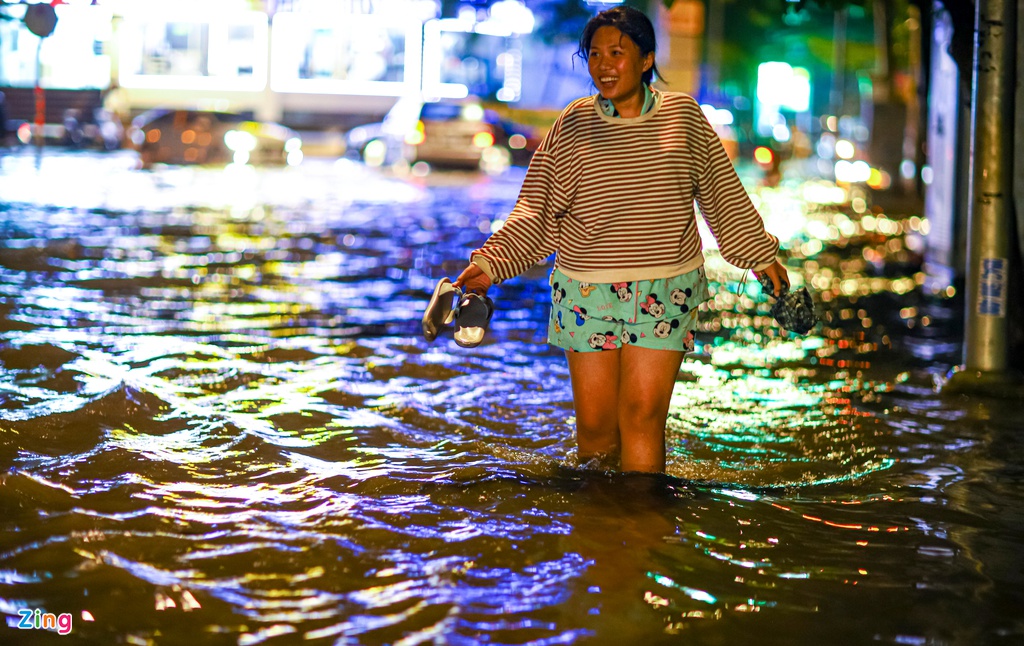 Người đi bộ tháo cả giày để di chuyển qua vùng ngập nước.