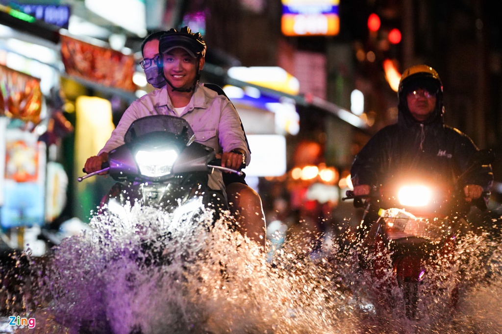 Tại trung tâm TP.HCM, phố đi bộ Bùi Viện kéo dài hơn 500 m ngập lênh láng nước lúc 19h.