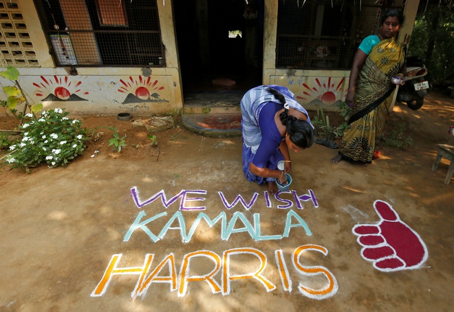 Dân làng Thulasendrapuram thể hiện sự ủng hộ đối với bà Harris. Ảnh: Reuters.