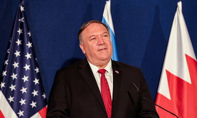 Ngoại trưởng Mỹ Mike Pompeo tại buổi họp báo chung với Thủ tướng Israel và Ngoại trưởng Bahrain ở Jerusalem hôm 18/11. Ảnh: AFP.