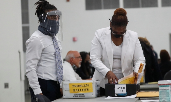Nhân viên kiểm phiếu ở Detroit, Michigan, hôm 4/11. Ảnh: Reuters.