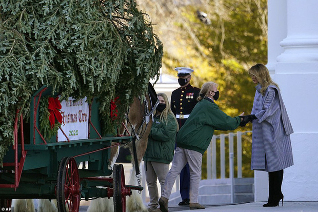 Theo đó, Đệ nhất phu nhân Mỹ đến nhận cây thông Noel dùng để trang trí trong dịp lễ Giáng sinh truyền thống tại Nhà Trắng vào năm nay. Bà Melania Trump xuất hiện với vẻ ngoài rạng rỡ, bà mặc chiếc áo khoác Balenciaga màu đen và trắng, đeo găng tay và đôi bốt cao gót đồng màu.