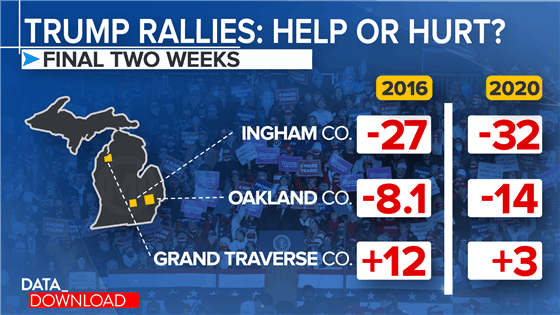 Ngày 27/10, ông Trump tổ chức một cuộc vận động bầu cử ở hạt Ingham. Ông Trump thất bại tại hạt này khi kém ông Biden 32 điểm %. Kết quả này nhiều hơn 5,5 điểm % so với kết quả năm 2016.
